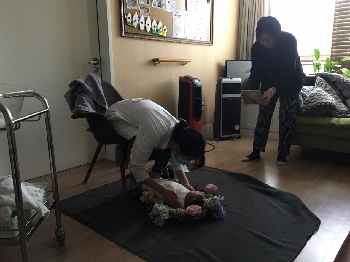 As part of our birthing center’s package, the photographers from a nearby studio come and take a free newborn shot of the baby.