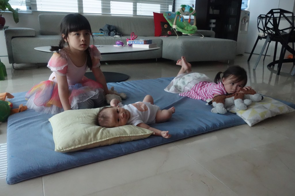 The girls like to put down a mat in the middle of the living room floor and bring in their favorite lovies and stuffed animals for “movie night,” which is usually on Sundays and lately features Moana or Trolls the Movie. Luna obviously doesn’t watch movies yet but she did take a few minutes to lay around with her sisters.