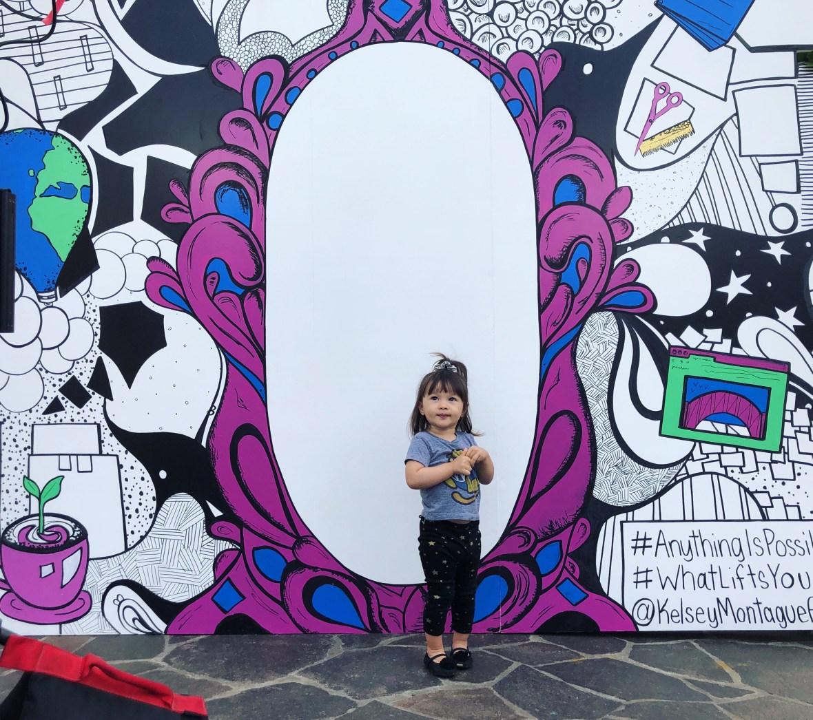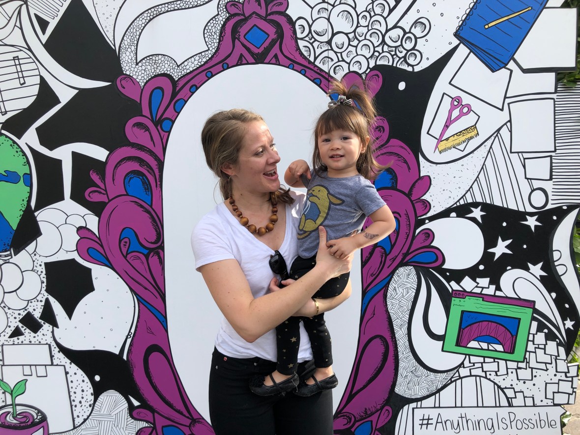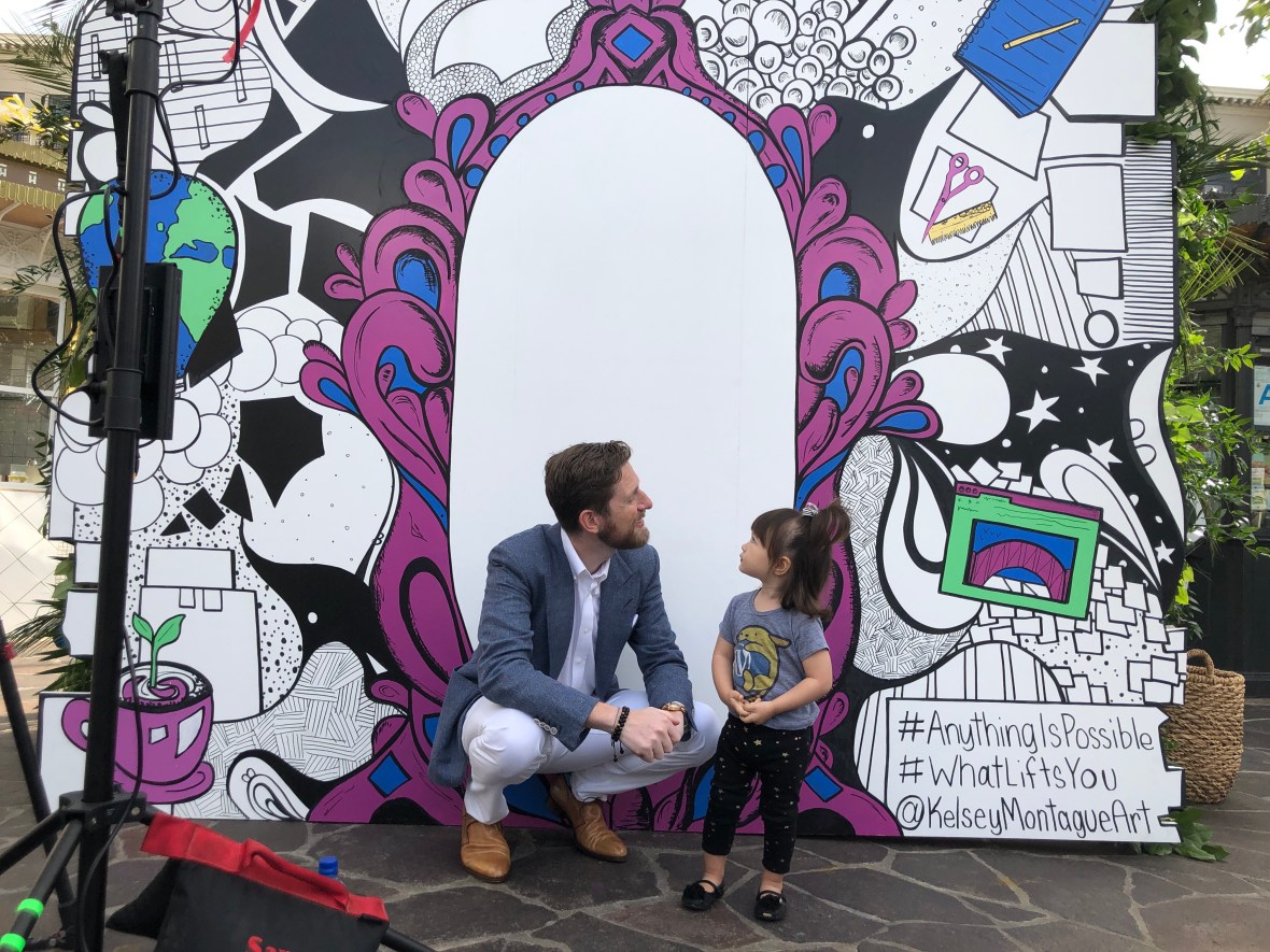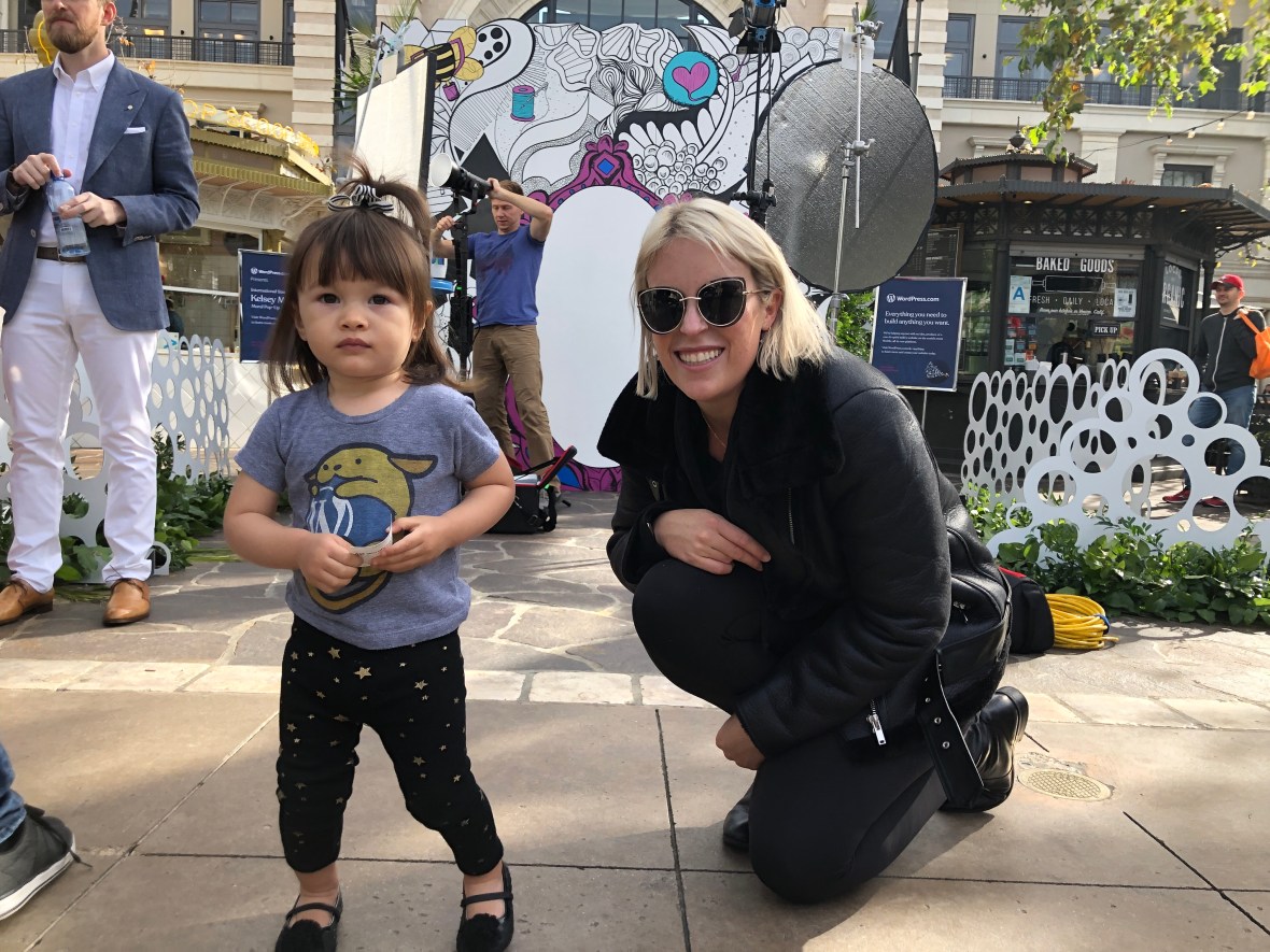 Luna joined me at The Grove to stop and see Matt, whose company WordPress is sponsoring the latest work by Kelsey Montague. Montague’s murals are well known and loved across Southern California and beyond. Luna not only helped show her WordPress pride, she got to meet the artist and put her angle wing mural tattoos on both her forearms.