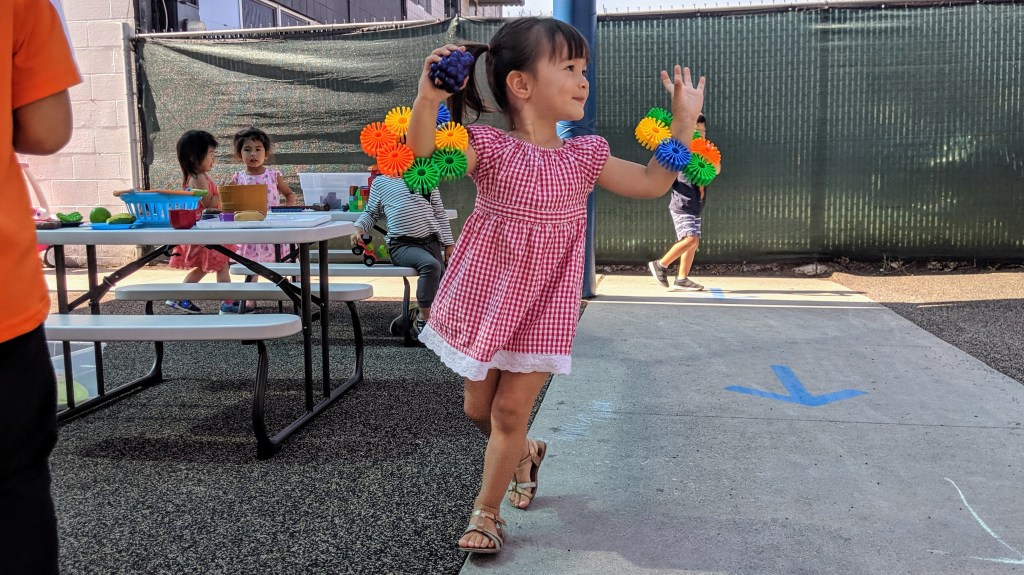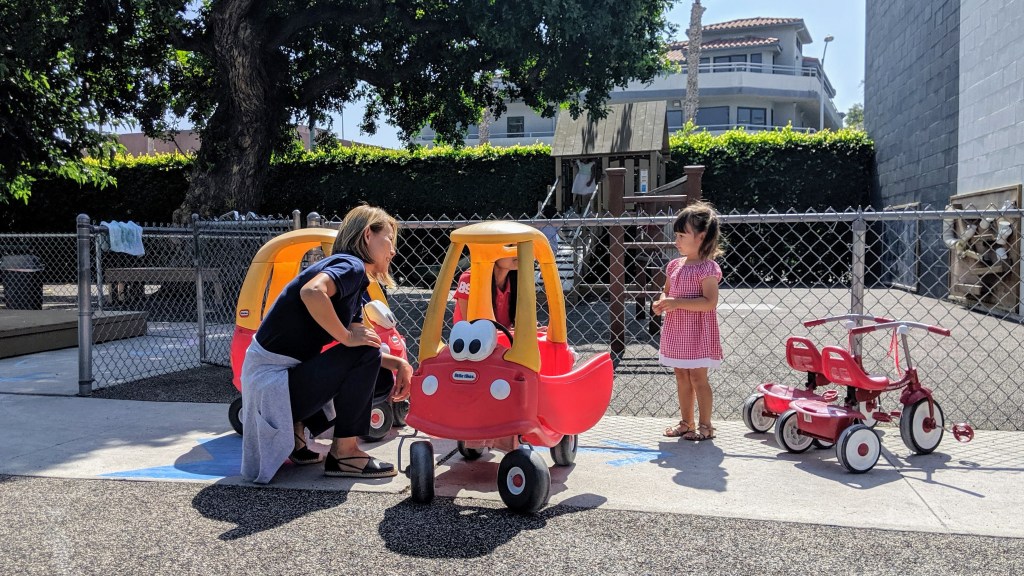 Luna had another warm-up playdate to get used to the teachers and layout at her new Montessori school, which starts in September. She met one of the Mandarin teachers (Ms. Eva), drove plastic cars and played with interlocking toys she fashioned into “bracelets”.