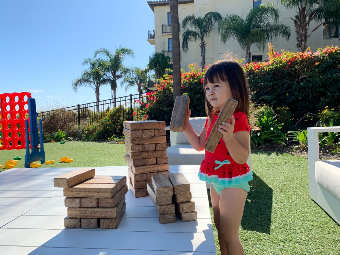Hung out with our visiting friends from Chicago at their resort for the week, Terrenea in Ranchos Palos Verdes. Luna loved Cornhole, jumbo Jenga and snuggling on mom a lot more than pool time today.