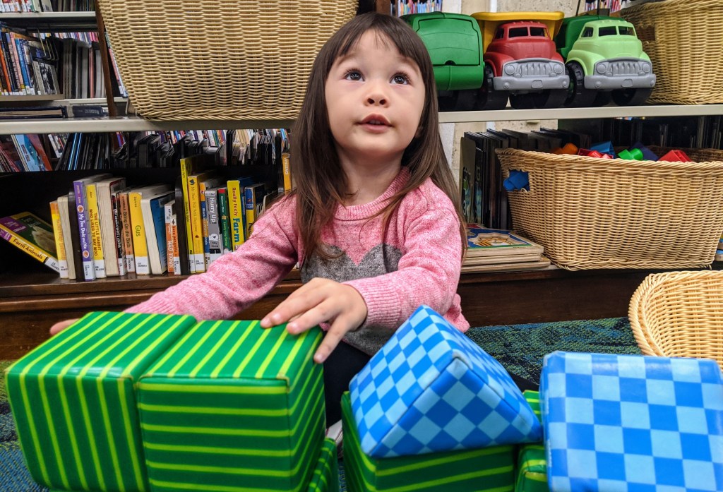 Luna made use of all the library’s toys — blocks, cars, kitchen, etc.