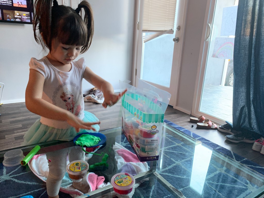 Luna’s favorite toys are toy cars and play doh. She occupies herself on her own for long swaths of time creating “food” with play doh and it makes a mess. Yesterday was got a special package in the mail —- auntie Sarah sent Luna super light clay that doesn’t make a huge mess. Luna loves the color variety and the texture of this stuff.