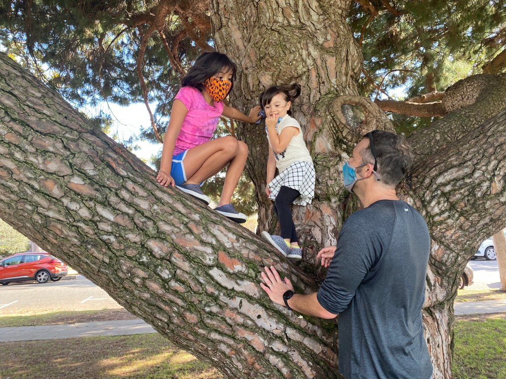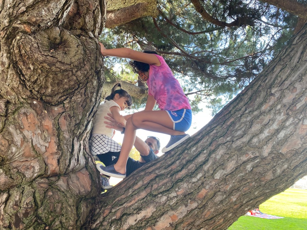 When Luna saw Evas friend Lucy was going to get up on a tree, she volunteered to have Uncle Ryan get her up there, too. The girl loves trying to climb trees.