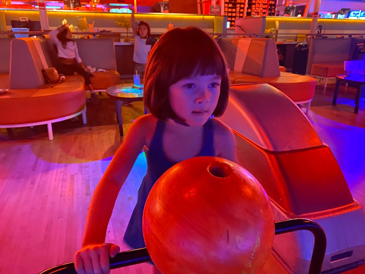 Luna went bowling for the first time, the physics of which she grasped rather quickly. She figured out she needed to use heavier balls to get more power down the ramp. The girls had a good time cheering each other on — a lot of shared celebratory hugs between isa and Luna.